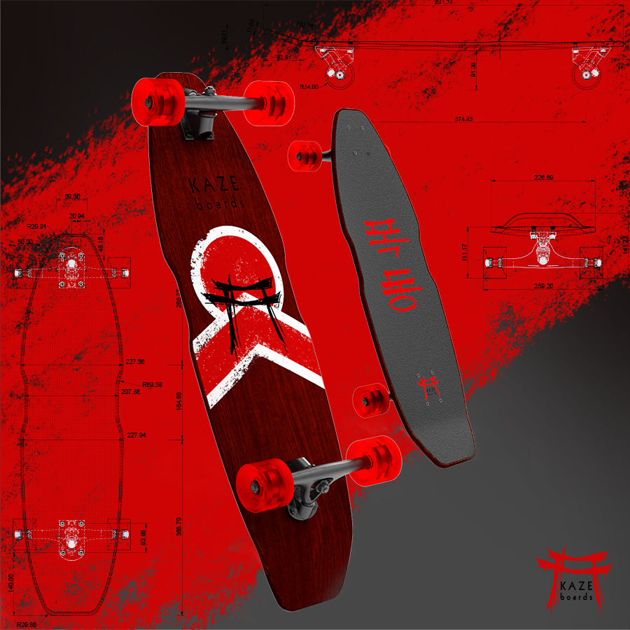 Das ganze Board ist im East-Asia-Style gestaltet, mit dem stilisierten Sonnenaufgang über dem Fujiyama und dem Torii davor. Im finalen Render wurde noch ein passender Hintergrund und die technischen Darstellungen eingefügt, um den dynamischen Eindruck zu verstärken.